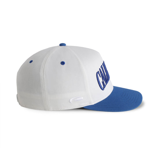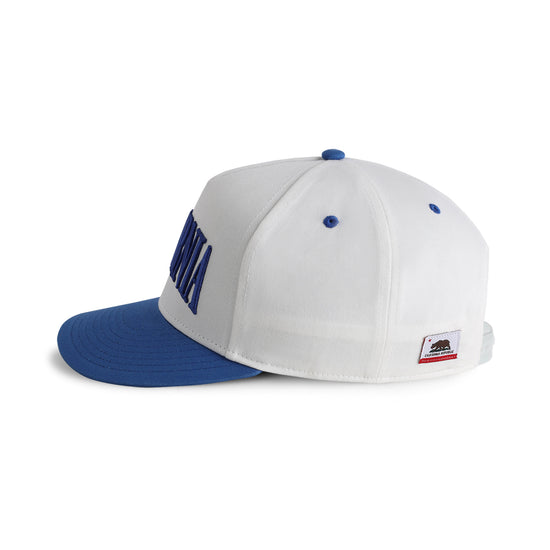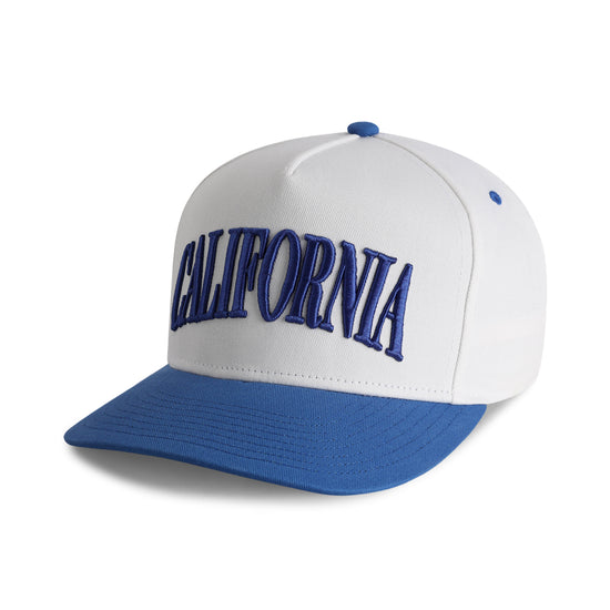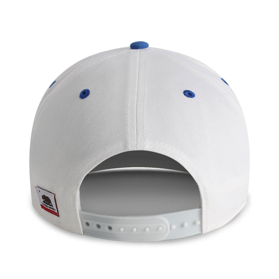 The California snapback showcases a 5-panel, high crown design with a structured fit and slight curve visor. Made from durable cotton twill, it features contrasting eyelets and visor for a sharp look. Finished with raised embroidered lettering and a state flag woven label for added authenticity.
