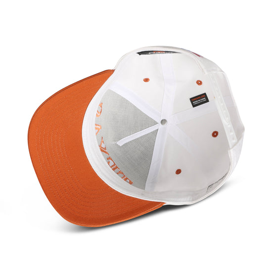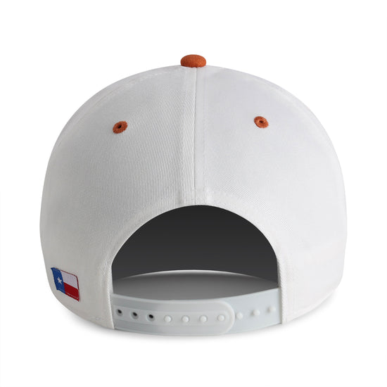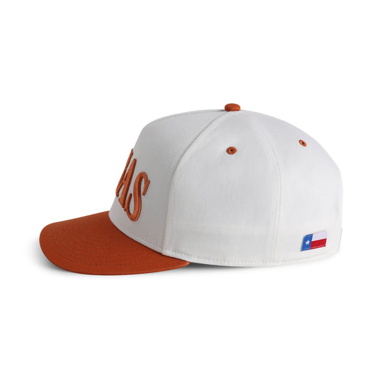 The Texas snapback showcases a 5-panel, high crown design with a structured fit and slight curve visor. Made from durable cotton twill, it features contrasting eyelets and visor for a sharp look. Finished with raised embroidered lettering and a state flag woven label for added authenticity.